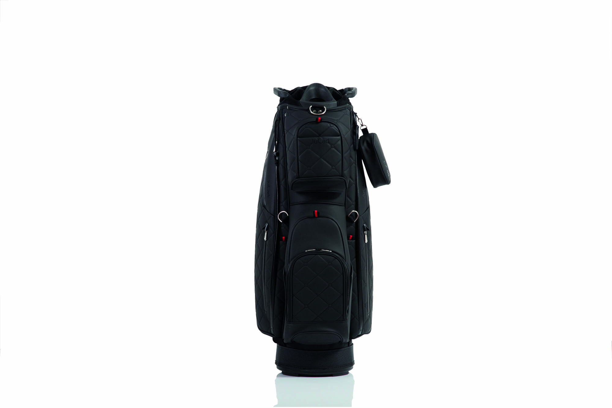 Diese Premium-Tasche mit luxuriös gesteppter Außenseite im Retro-Look und wasserabweisendem Leder-Finish, das angenehm in der Hand liegt, steckt voller Features. Die beiden äußeren Fronttaschen sind dank Magnetverschlüssen schnell und einfach zu bedienen. Das obere Taschenfach mit Magnetverschluss ermöglicht superschnellen Zugriff (zum Beispiel auf den Entfernungsmesser) und lässt sich per Klettverschluss auch abnehmen, sodass der Taschenaufsatz darunter verschwindet. Auch das geräumige Getränkefach ist dank Magnetverschluss leicht zugänglich. Wertsachen finden in einer abschließbaren Innentasche mit Reißverschluss Platz und zahlreiche weitere Zubehörfächer erleichtern die Handhabung während des Spiels.