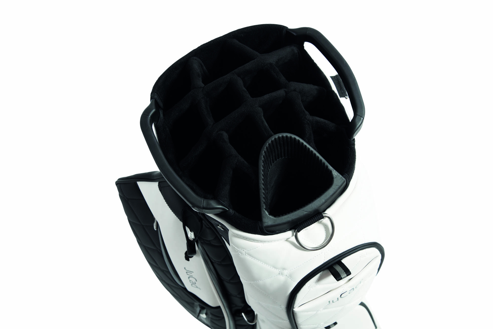 This premium bag, with its luxuriously quilted exterior in a retro look and water-repellent leather finish that feels great in your hand, is packed with features. The two exterior front pockets are quick and easy to use with magnetic closures. The top bag compartment with magnetic closure provides super-fast access (for example, for the rangefinder) and can also be detached with a hook-and-loop closure, allowing the bag attachment to disappear underneath. Furthermore, the spacious drinks compartment is easily accessible thanks to the magnetic closure. Valuables are stored in an inner zippered pocket that can be locked, and numerous other accessory compartments make handling easier during play.